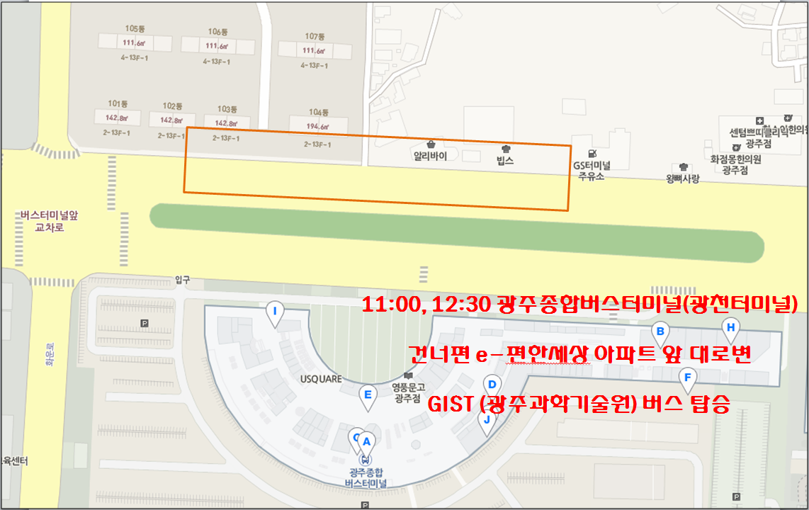 오전 11시 출발: 광주종합버스터미널(광천터미널) 건너편 e편한세상 아파트 → GIST