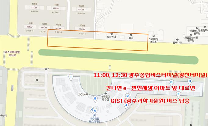 <당일 주요일정> 11:00~11:20 광주종합버스터미널(광천터미널) → GIST 이동(1차 출발) 11:30~12:00 봄학기 2차기전형 입학설명회 (GIST 행정동1층 CT아트홀) 12:00~13:00 점심식사(제공) 12:30~12:50 광주종합버스터미널(광천터미널) → GIST 이동(2차 출발) 14:00~ 학과별로 오픈랩 진행 (학과마다 시작 시간이 다르므로, 글 하단의 장소 및 시간 확인바랍니다.) ◎ 오실 때 1차 출발 오전 11시 출발: 광주종합버스터미널(광천터미널) 건너편 e편한세상 아파트 → GIST ◎ 오실 때 2차 출발 오후 12시 30분 출발: 광주종합버스터미널(광천터미널) 건너편 e편한세상 아파트 → GIST * 이 경우 행사일정에 의하여 입학설명회 참석과 점심식사는 제공해드리기 어렵습니다.^^  ◎ 가실 때 1차 출발 저녁 6시 출발: GIST 기계공학부 앞 → 광주종합버스터미널(광천터미널) ◎ 가실 때 2차 출발 저녁 7시 출발: GIST 기계공학부 앞 → 광주종합버스터미널(광천터미널) * 광주송정역 쪽 셔틀버스는 수요가 적은 관계로 운행하지 않음을 양지하여 주시기 바랍니다.