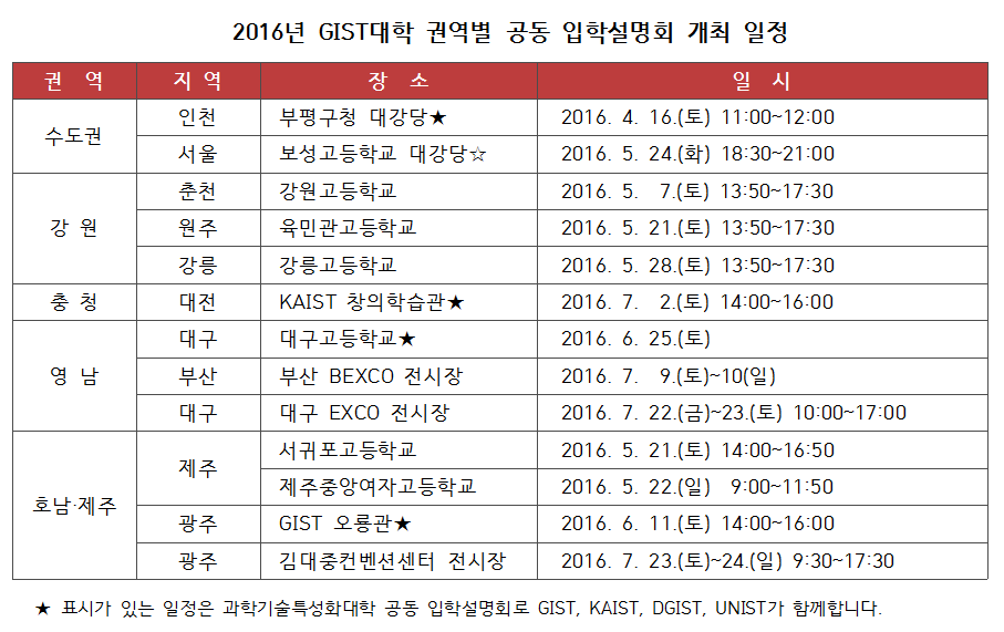 | 2016년 GIST대학 권역별 공동 입학설명회 일정 안내 | |||