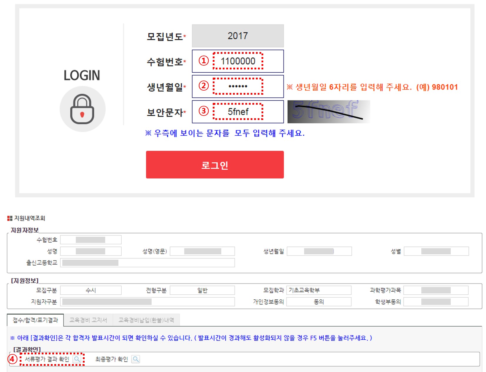 그리고 화면에 보이는 보안문자를 입력하여 로그인 후 서류평가 결과 확인